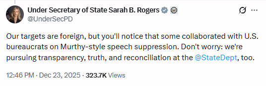 As I wrote in that piece, this goes beyond routine lying. The State Department is weaponizing a Supreme Court case that explicitly rejected claims of government censorship to justify actual, unambiguous government effort at punishing people for their speech. They’re inverting the legal record—taking a ruling that said “no, the government didn’t suppress speech” and using it as precedent to suppress speech.