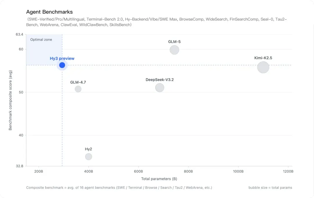 Hy3 still trails OpenAI and Google DeepMind’s flagships, but by the size-to-performance ratio, Hy3 preview is hard to dismiss: the agent benchmark composite shows it in the “optimal zone” with ~295 billion parameters, ahead of DeepSeek-V3.2 (600 billion+) and matching Kimi-K2.5 (over 1 trillion parameters) at a fraction of the compute cost.