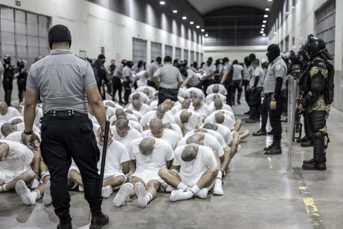A prison guard transfers Alien Enemies Act deportees from the U.S., alleged to be Venezuelan gang members, to the Terrorism Confinement Center in Tecoluca, El Salvador. Mar. 16, 2025 (El Salvador Presidential Press Office)