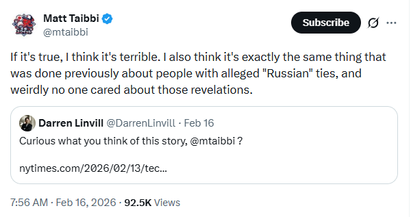 Matt Taibbi, who has spent the last few years on the confused idea that platform moderation is state censorship, offered a tepid, hedging response on X, saying “if true” this is terrible, before immediately pivoting to a strange whataboutism regarding investigations into actual proven Russian attempts at election interference.