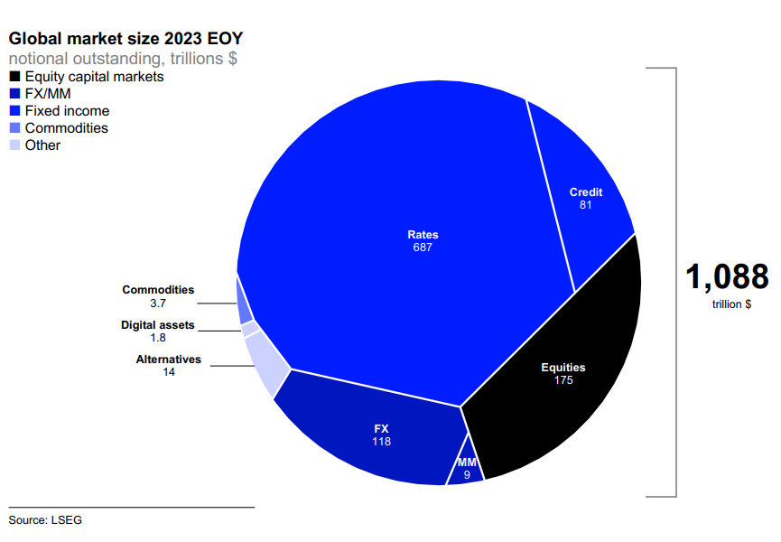 Crypto’s market size compared to other sectors in finance in 2023. Even though crypto’s market capitalization has grown to 3.2 trillion since then, it’s still a drop in the bucket. Source: LSEG