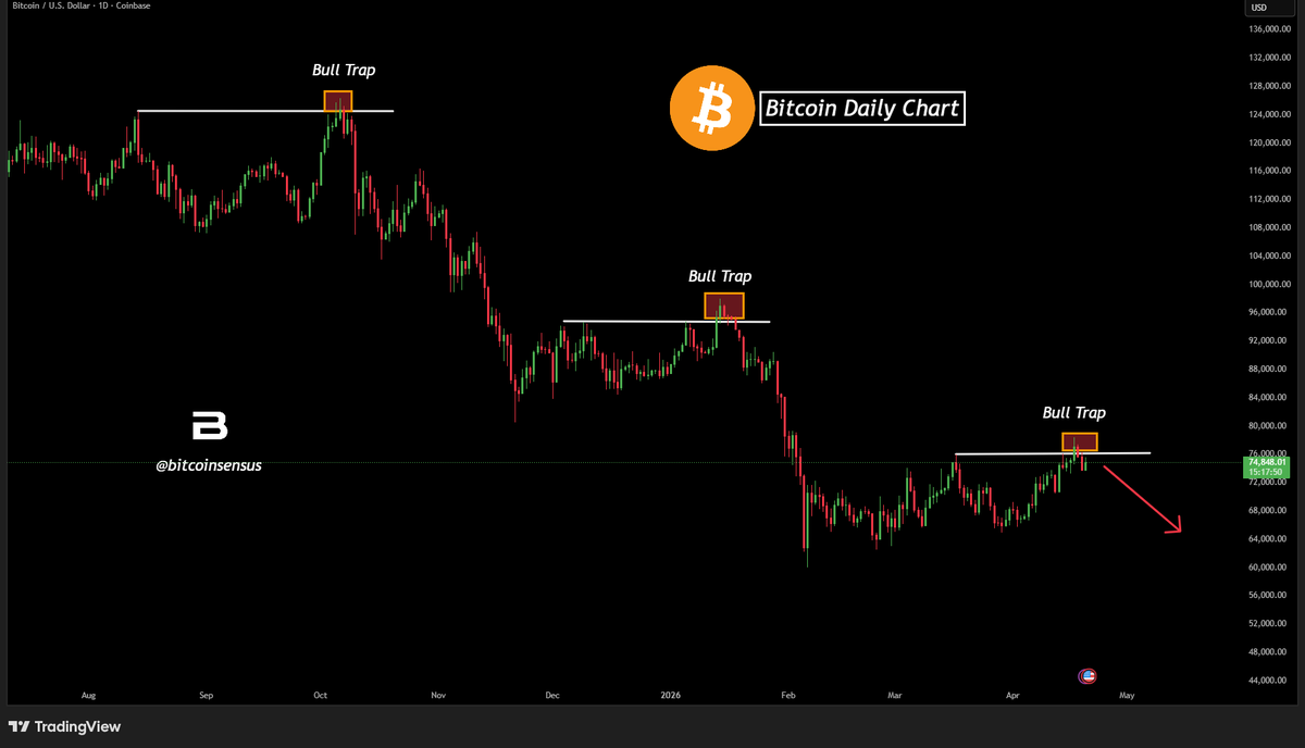 Fellow analyst Bitcoinsensus said failure to break above $78,000 would suggest that the latest rally was a “possible bull trap,” as seen in previous failed breakouts.