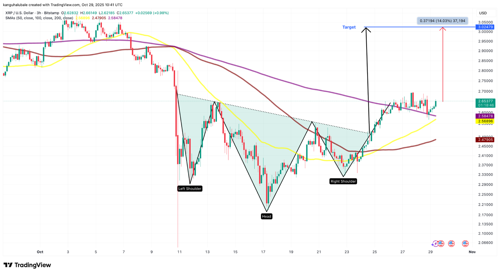 XRP price action has formed an inverse head-and-shoulders pattern in the three-hour time frame, which suggests a potential rally to $3, according to analysts.