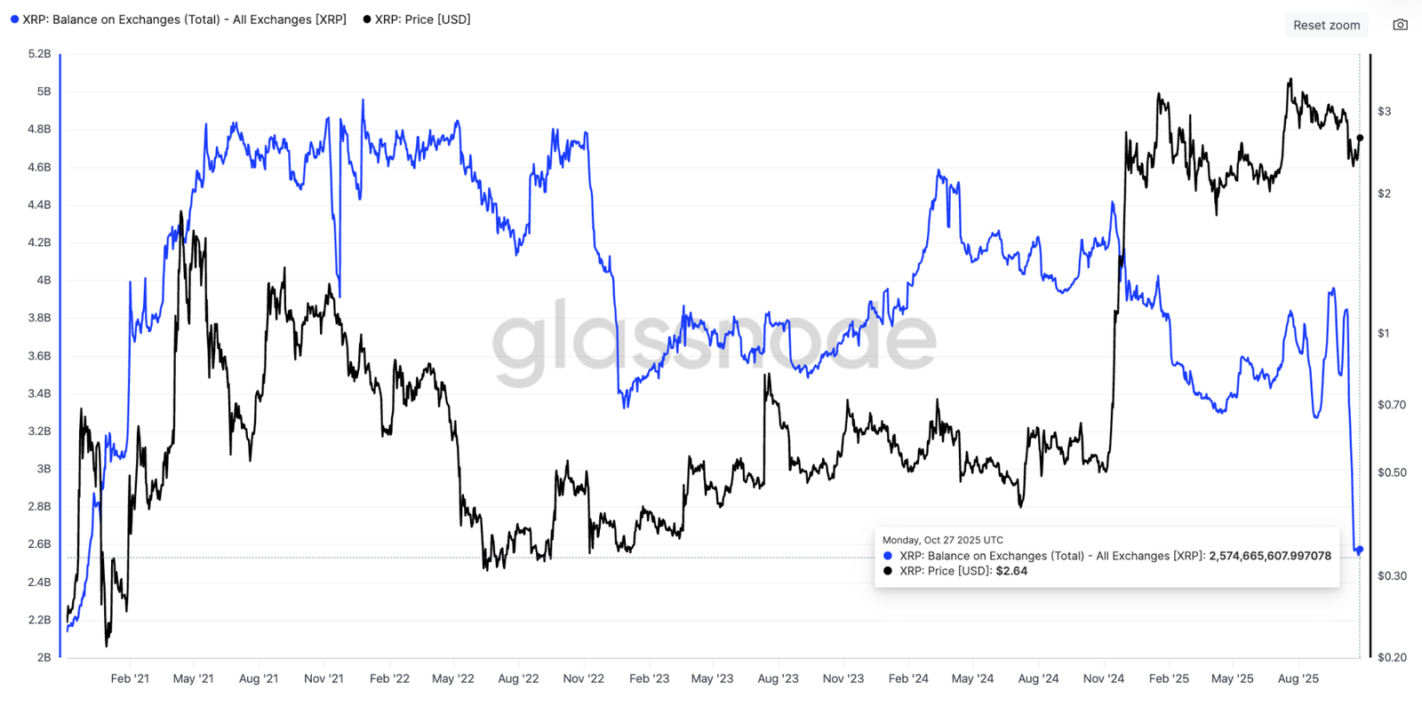 The chart below shows that the XRP balance on exchanges dropped by 1.4 billion tokens to 2.57 billion on Oct. 29 from 3.9 billion on Sept. 20.