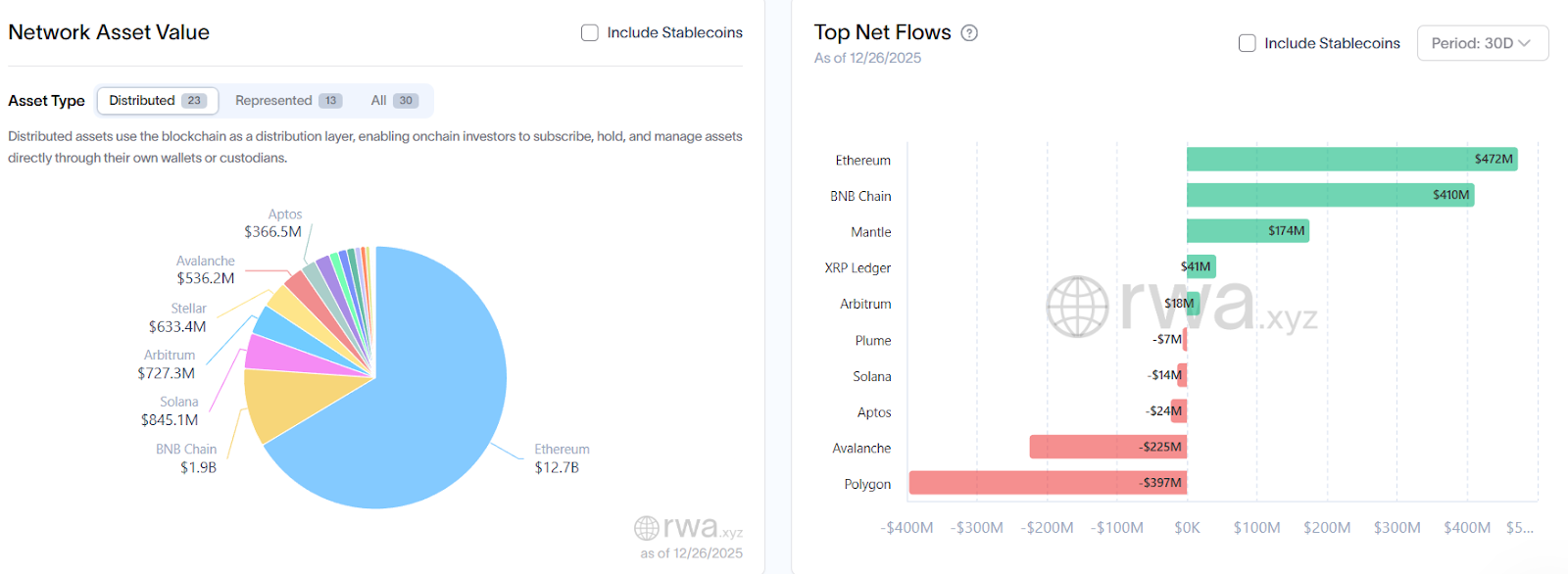 It commands a 65% market share of tokenized RWAs at $12.7 billion, while BNB Chain is in second place with 10.5%, or $1.85 billion, data from RWA.xyz shows.