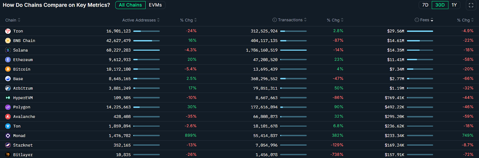 The Tron network, where stablecoin activity is dominant, ranked first with $29.5 million in fees. BNB Chain and Solana placed second and third respectively. The two blockchains are popular for token launches and retail trading activity.