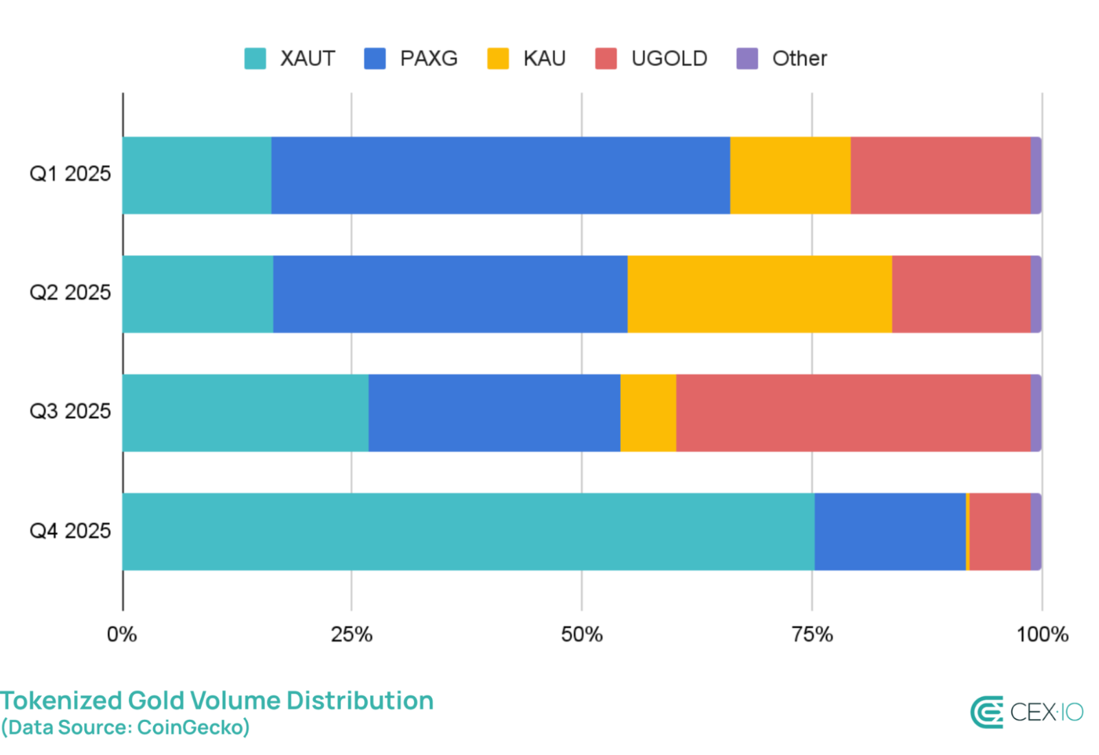 Much of the late-year surge was driven by Tether Gold (XAUT), which accounted for 75% of total trading volume, up sharply from 27% in Q3. According to its website, XAUT has a market cap of $2.42 billion and is backed by roughly 1,329 gold bars, or about 16,239 kilograms of physical gold.