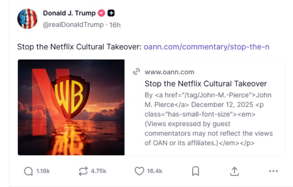 When this lazy “woke Netflix” campaign fails, I suspect the Trump DOJ will ultimately launch a bogus antitrust inquiry into the Netflix Warner Brothers merger. This campaign will highlight all manner of real and manufactured horrible impacts of the Netflix deal, ignoring the fact that letting one of the nation’s richest right wing extremists own most of U.S. media would be decidedly worse.