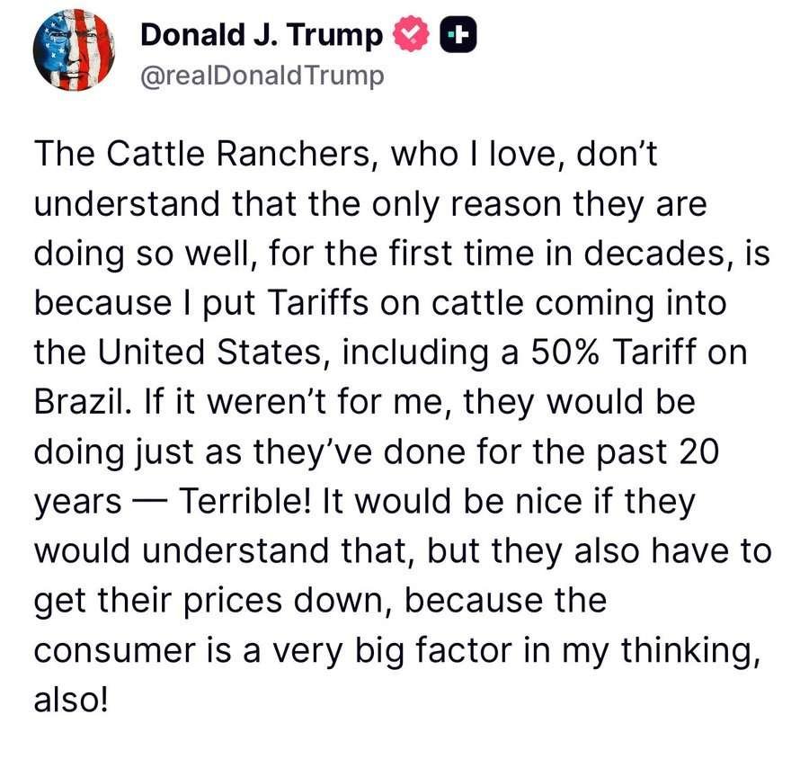 So, on one hand, the president believes he’s helping American cattle farmers by imposing tariffs on imported beef—particularly beef from Brazil, which is now subject to a 50 percent tariff. (Amusingly, that tariff is officially for “national emergency” reasons, but in reality, it exists simply because Trump got mad at the current government of Brazil for prosecuting his buddy, former Brazilian President Jair Bolsonaro.)