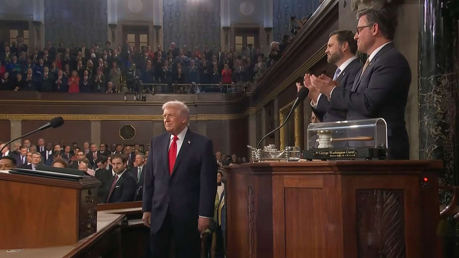 Trump did his usual showman shtick. He called out the U.S. hockey team, which just won Olympic gold (and produced an AI-generated meme in which the president was battling on the ice with the team). He said, “Space Force is my baby.” (How does Trump’s son, Barron, feel about that?) He referred to Democrats as “pro-crime.” He claimed to have ended eight wars in 10 months, producing a memorably pained look on Secretary of State Marco Rubio’s face. (He nearly did the meme.) And he got Democratic Sen. Elizabeth Warren to stand and clap for a line about congressional insider trading, making for a little bit of real-life horseshoe theory.