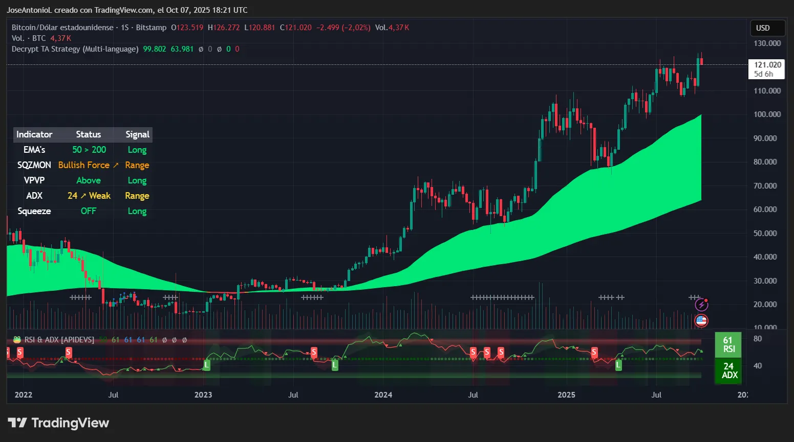 Bullish scenario: Bitcoin consolidates briefly between $122,000-$126,000 before pushing toward $130,000-$135,000 by mid-to-late October. Ethereum and the rest of the altcoins follow as usual with more intensity. ETF inflows remain robust, ADX readings strengthen above 30 confirming powerful trends, and altcoins begin catching up in a broad-based rally. This would align with Uptober’s historical pattern and current fundamental drivers.