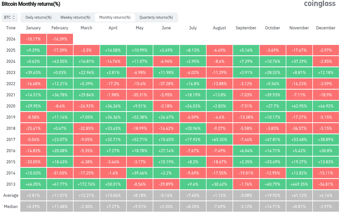 At the time of writing, BTC/USD roughly matched February 2025 in terms of performance, with losses nearing 17% month-to-date.
