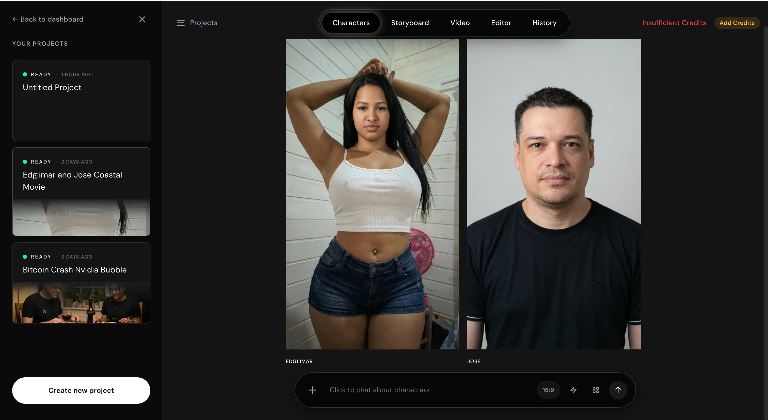 The main screen looks like ChatGPT or any typical chatbot interface. From there, you navigate five tabs: Characters, Storyboard, Video, Editor, and History.