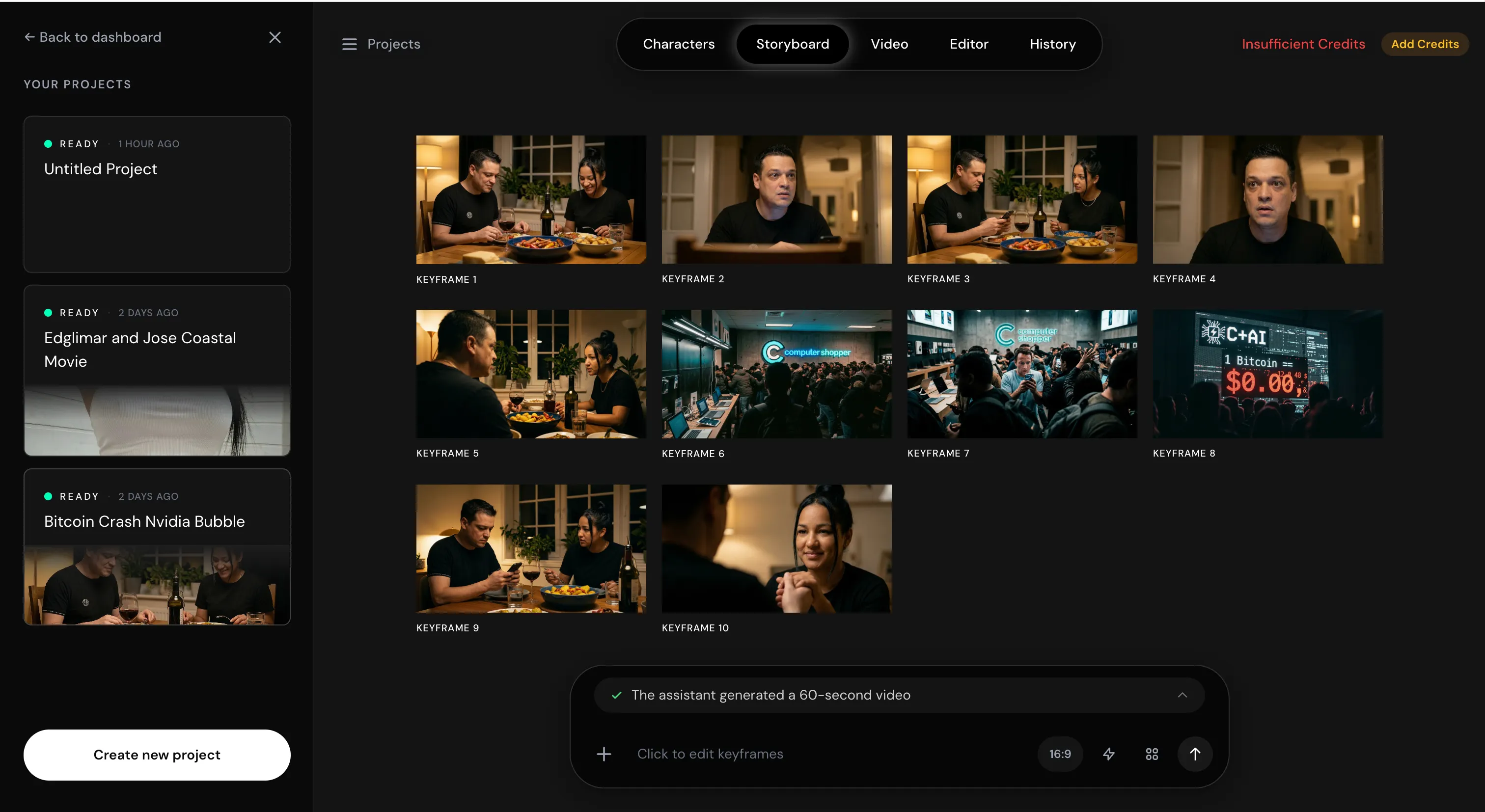 PAI rewards detailed input here. The more you explain—what the characters do across each scene, what they say, and how the story moves—the better the model works. Feed it that specificity and it will use AI to expand on the details, then construct around a dozen keyframes. Each frame comes with a scene image and a description of what is happening at that exact moment: character actions, dialogue, and visual composition.