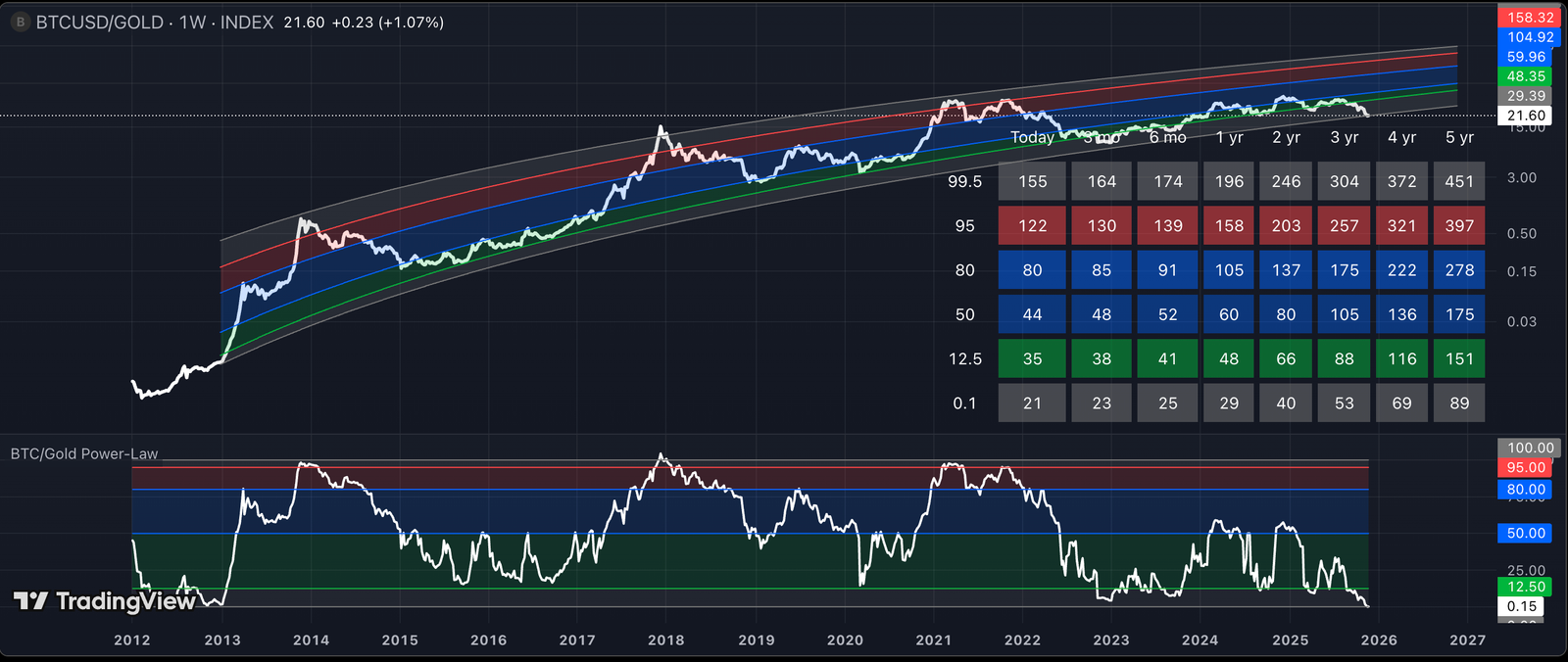 Historically, moves in the BTC/XAU ratio toward the −2 standard deviation zone preceded extended periods of Bitcoin outperforming gold, as shown in the Power-Law bands graph below.