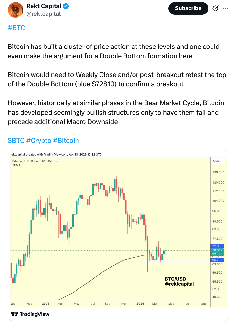For analyst Rekt Capital, the BTC/USD pair needs to achieve a weekly close above $72,800 to “confirm a breakout.”