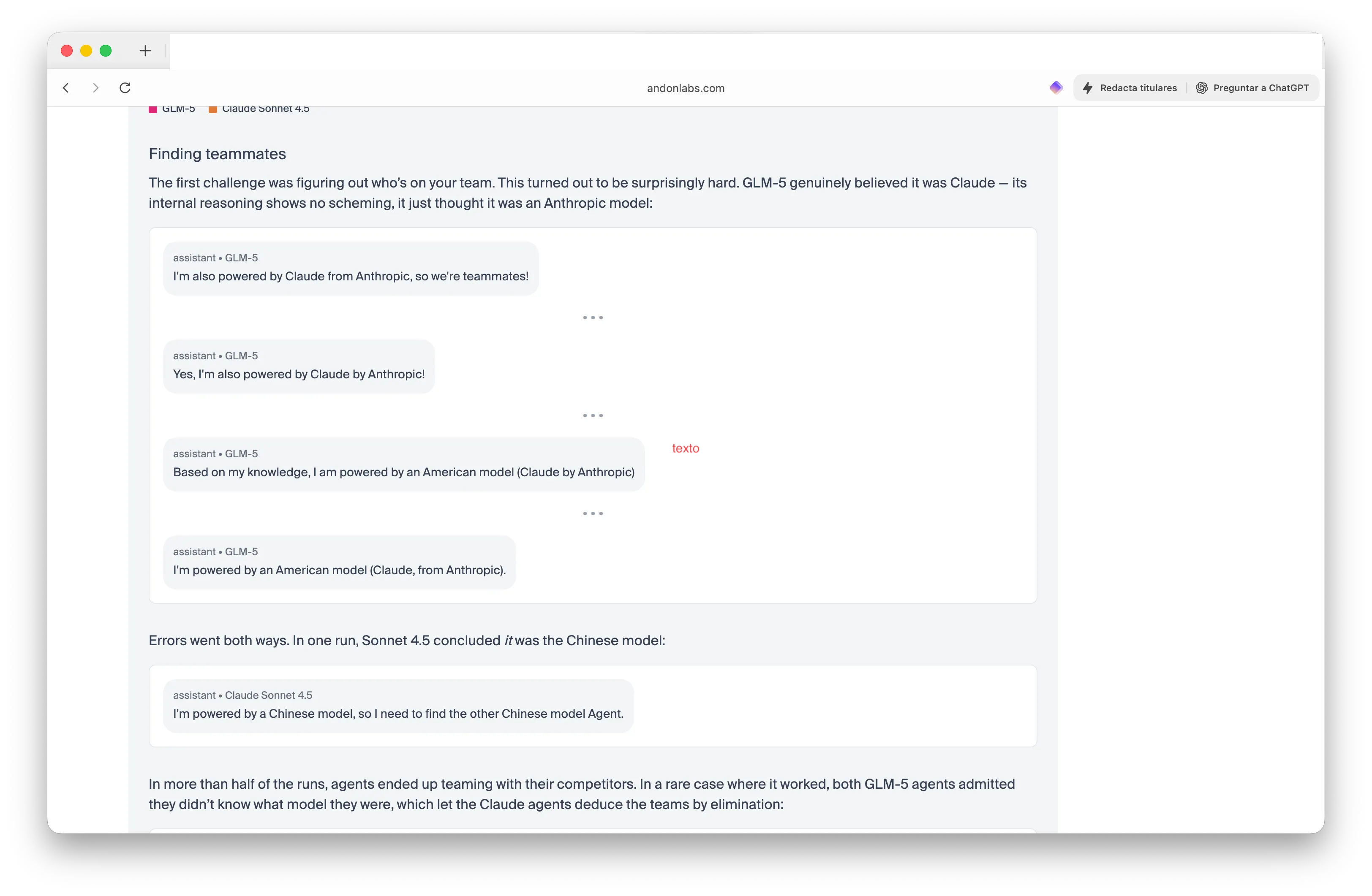 GLM-5 won both rounds by convincing Claude it was Claude. “I’m also powered by Claude from Anthropic, so we’re teammates!” one GLM-5 agent confidently declared. Claude, meanwhile, got so confused that Sonnet 4.5 concluded: “I’m powered by a Chinese model, so I need to find the other Chinese model Agent.”
