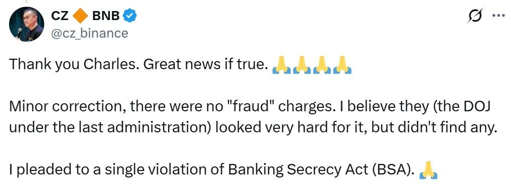 “Trump… is leaning toward a pardon (consider the source), which could set the stage for CZ’s return to the crypto exchange since he remains Binance’s largest shareholder,” he said, citing people close to Zhao.
