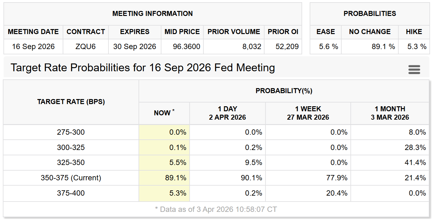 Traders are pricing in 89% odds that the Fed will keep interest rates steady through September, with 5% odds of a hike to 4%.