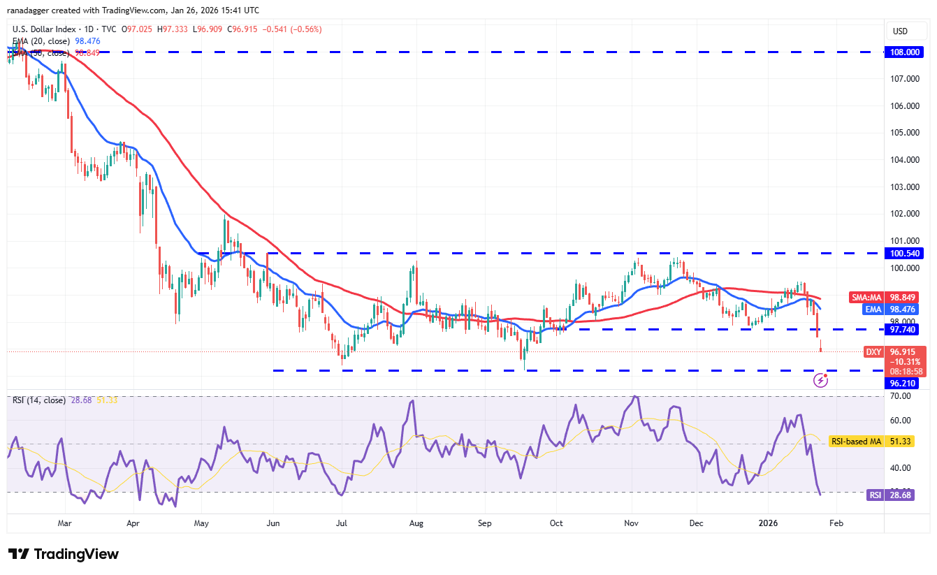 Sellers will attempt to yank the price to the solid support at 96.21, which is a critical level to watch out for. If the support gives way, the index may resume the downtrend toward the 94.62 level.