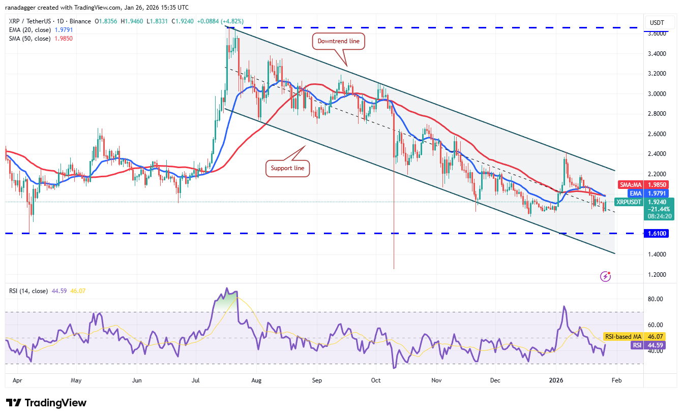 There is support at $1.81, but the relief rally is likely to face selling at the 20-day EMA ($1.97). If the price turns down sharply from the 20-day EMA, the XRP/USDT pair may tumble to the solid support at $1.61.
