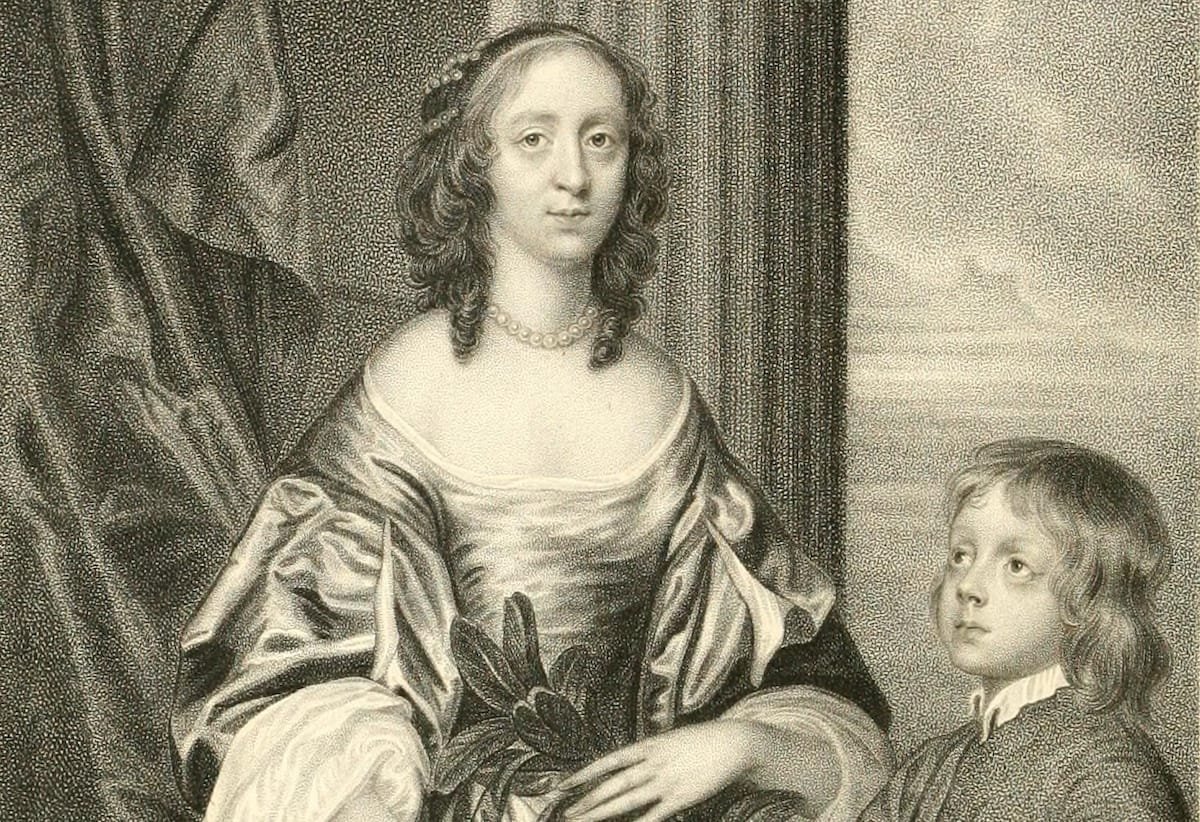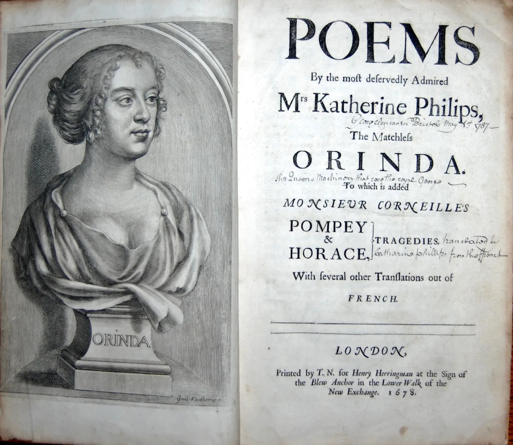 The poet and translator Katherine Philips (née Fowler) was a passionate Royalist, despite being married to a Welsh parliamentarian, James Philips, who supported the Parliamentary cause. She attended a boarding school in Hackney, where she was an eager reader of European literature. Like many female authors of the period, she wrote about style and language, while also composing her own poetry and translating works from French. Members of her Welsh writers’ group, the Society of Friendship, took on classical-sounding pseudonyms. Philips was Orinda (more specifically, “The Matchless Orinda”), while her husband was “Antenor,” and their friend Sir Charles Cotterell, “Poliarchus.”