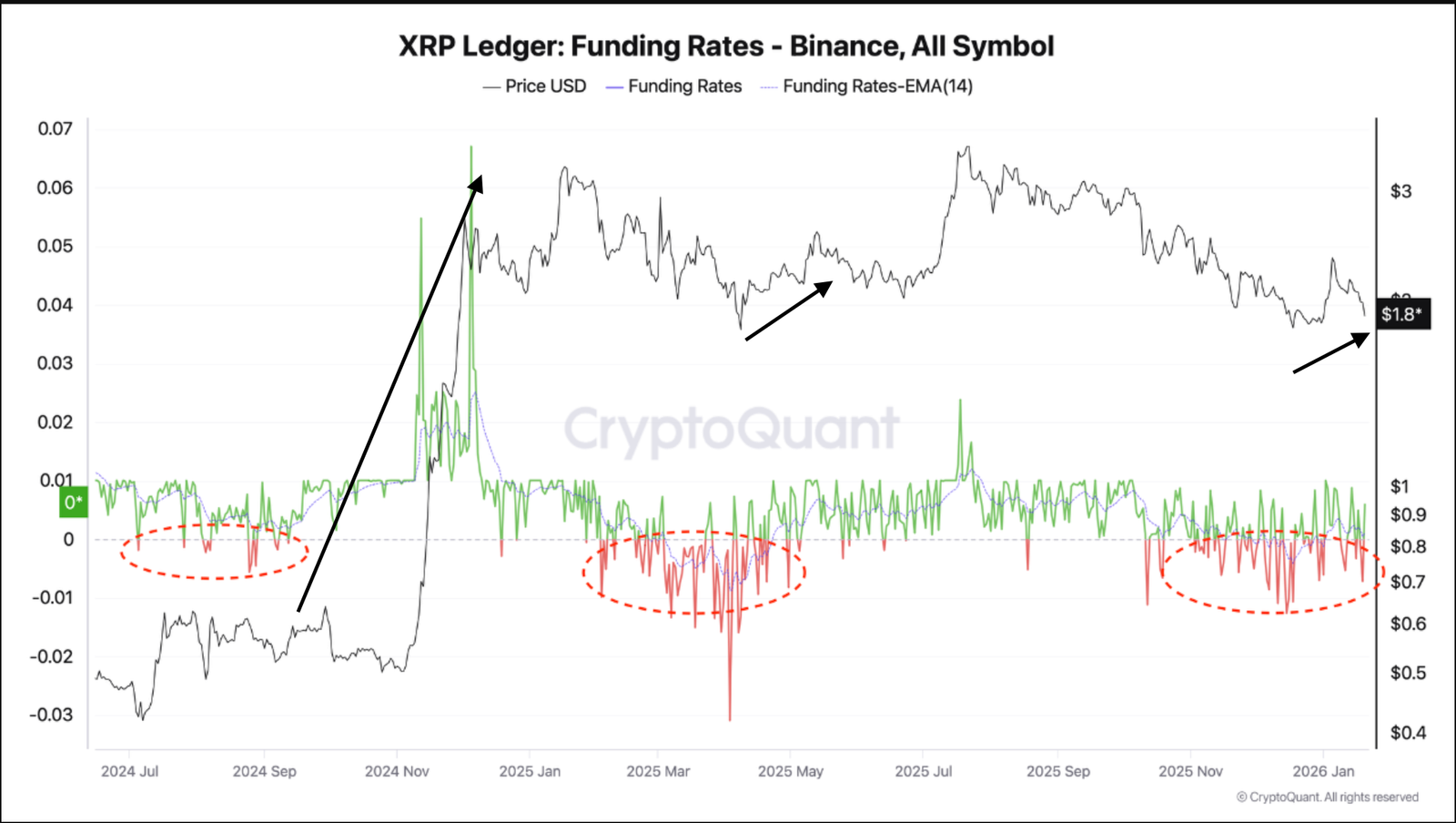 XRP (XRP) funding rates on Binance have been mirroring the behavior seen ahead of sharp price rebounds since 2024.