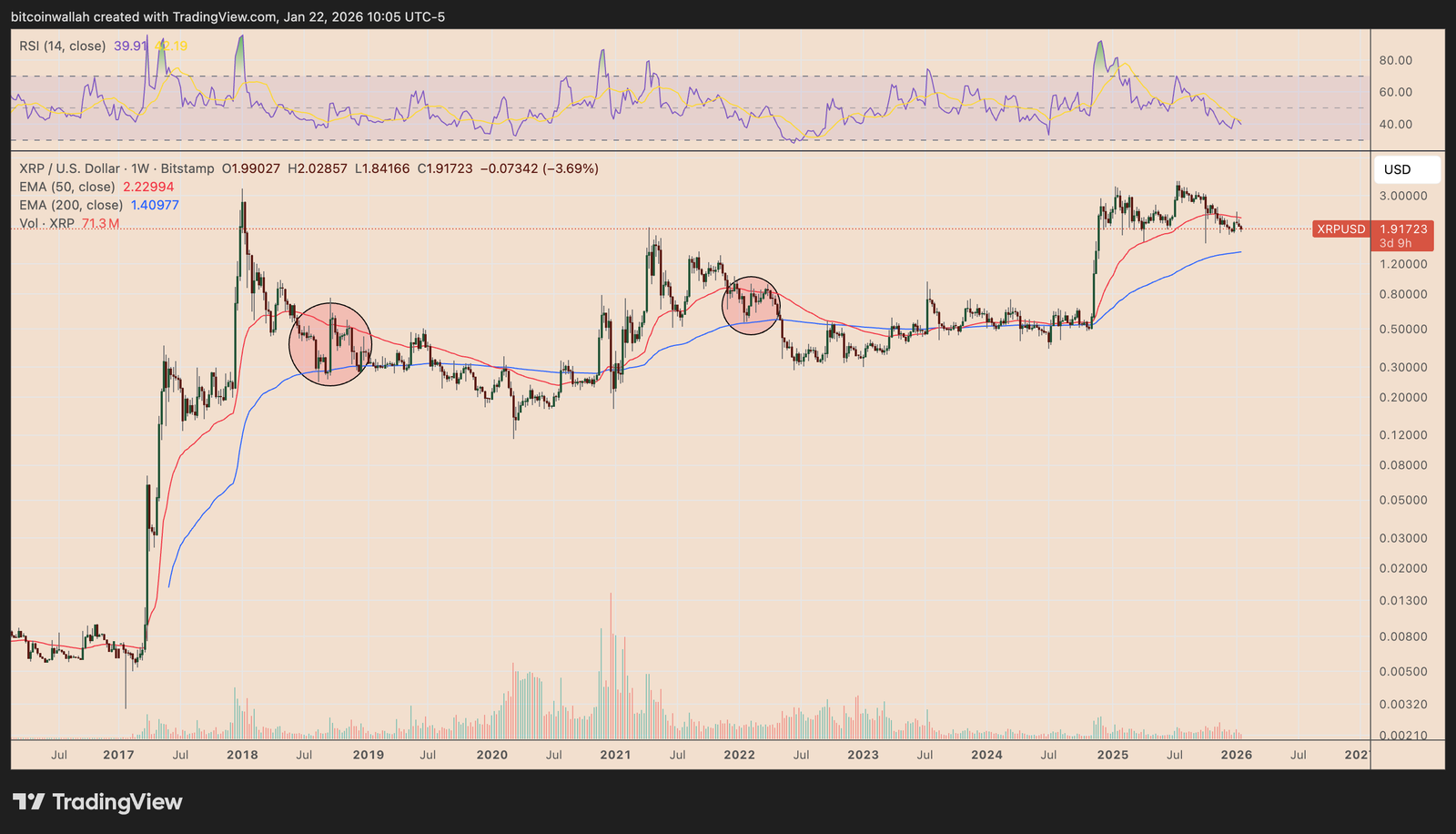 From a technical standpoint, XRP bears are looking to pull the price toward its 200-week exponential moving average (200-week EMA blue wave) at around $1.40 if it fails to reclaim its 50-week EMA (red wave) at $2.22 as support.