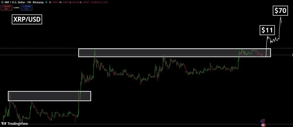 “The next impulse will take XRP to $11 and the last wave to $70,” CryptoBull added.