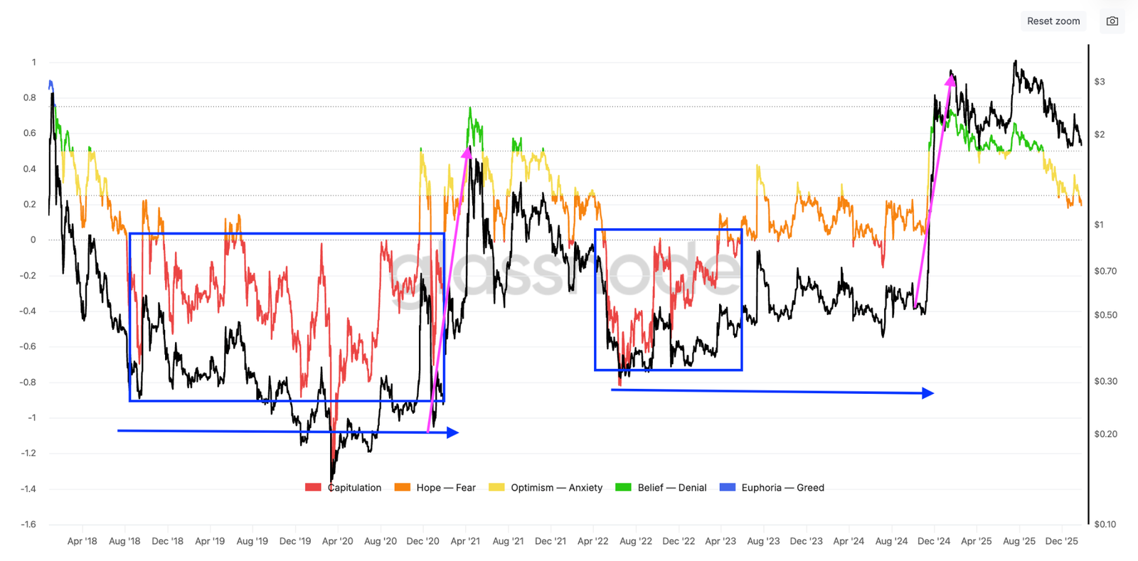 XRP’s net unrealized profit/loss (NUPL) indicator has entered the “capitulation zone (red),” a position that is typically associated with cycle bottoms.