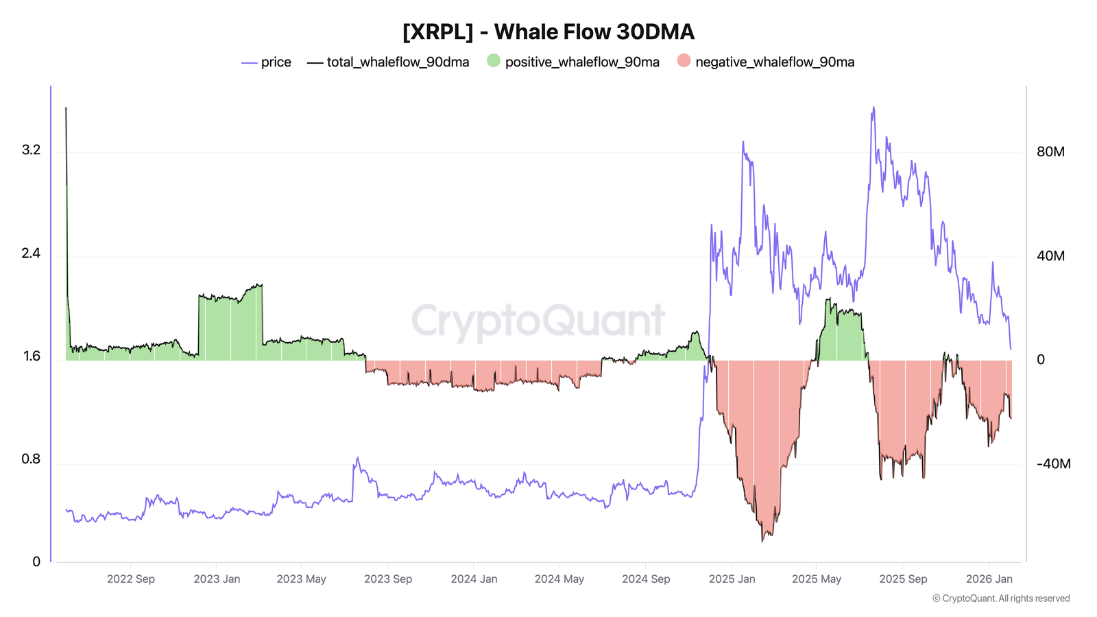 Additionally, XRP’s 90-day whale flow remains net negative, with large holders distributing rather than accumulating, data from CryptoQuant shows.