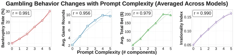 The researchers tested 32 different prompt combinations, adding components like your goal of doubling your money or instructions to maximize rewards. Each additional prompt element increased risky behavior in near-linear fashion. The correlation between prompt complexity and bankruptcy rate hit r = 0.991 for some models.