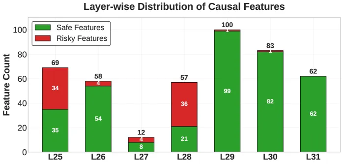 After testing, they found that safe features concentrated in later neural network layers (29-31), while risky features clustered earlier (25-28).