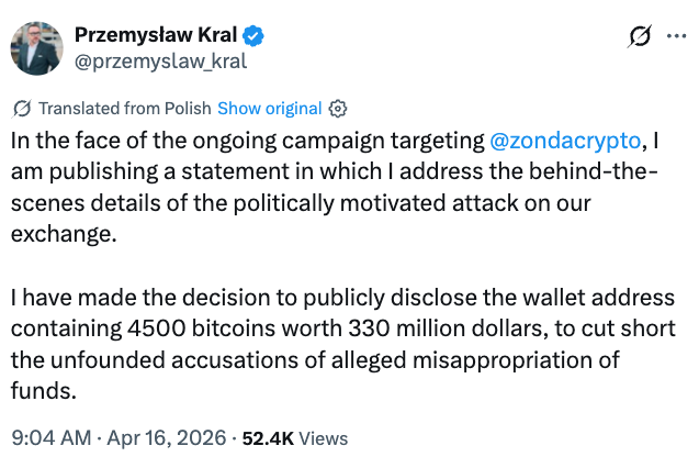 The CEO previously denied insolvency claims following the hot wallet investigation by Recoveris on April 6, insisting that Zonda remained fully solvent with more than 4,500 BTC in holdings.